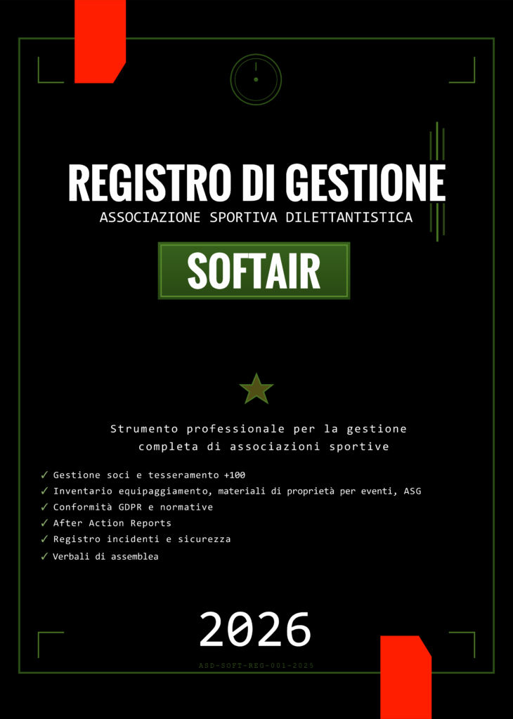 Questo registro rappresenta la soluzione definitiva per presidenti, dirigenti e amministratori di ASD softair che desiderano gestire la propria associazione con la massima professionalità, nel pieno rispetto delle normative vigenti e con standard organizzativi di eccellenza.